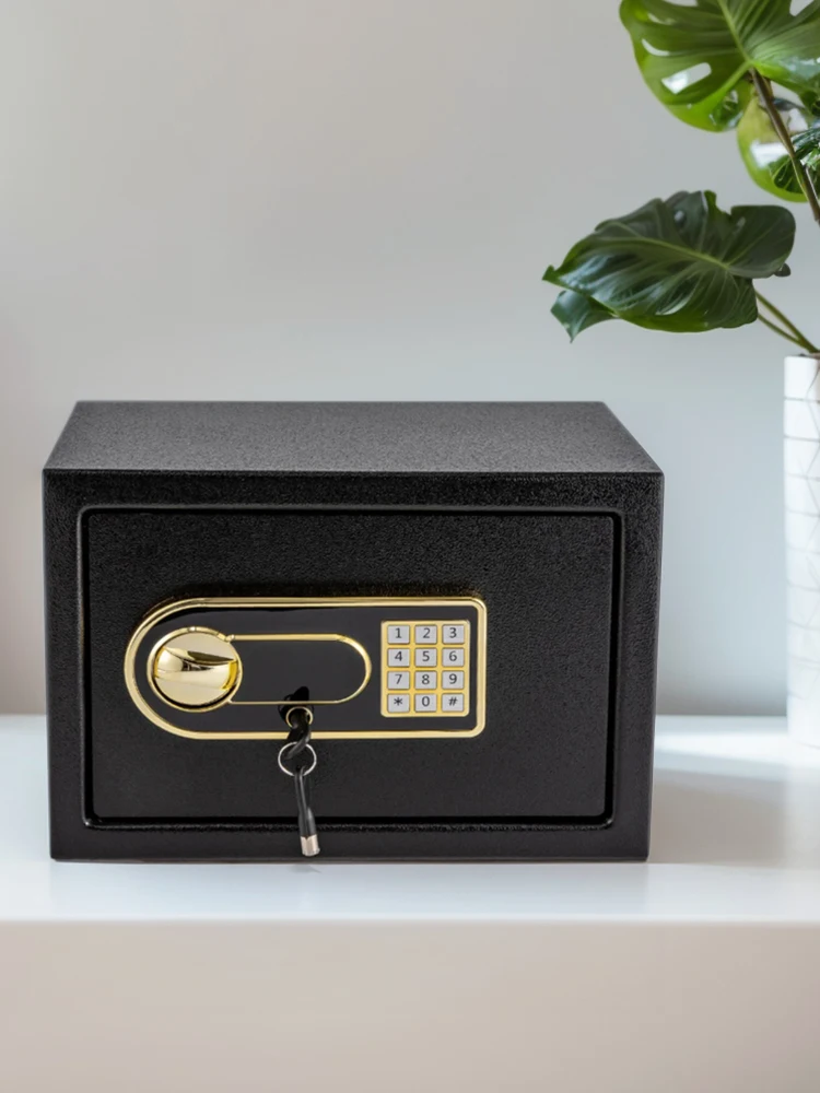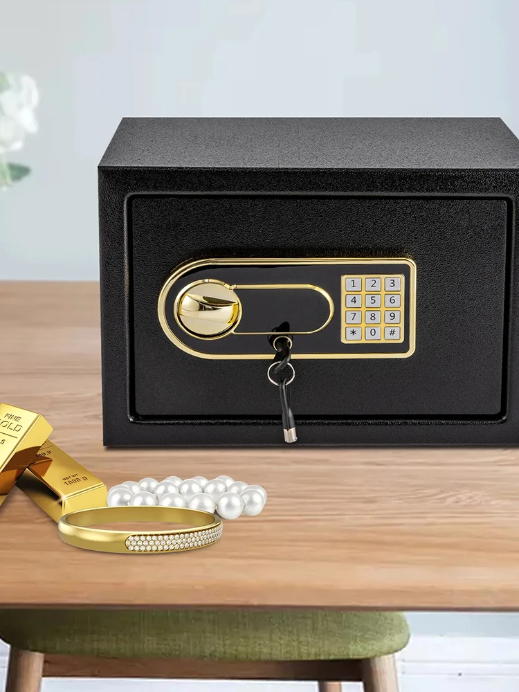 Electronic Security Box Anti-Theft Password Security Box Security Locked Cabinet for Home Office Hotel Business Features: 1. Impact-Resistant Construction: Made from heavy-duty materials, this large safety box boasts high resistance to impacts and tampering, safeguarding your savings from external shocks or damage to ensure reliability and durability. 2. Reinforced Security Features: Equipped with thickened explosion-proof bolts and an inconspicuous lock hole, this digital safe box enhanced anti-tamper capabilities with a sleek, modern design that adds a sense of sophistication to any space. 3. Spacious Storage Solution: With its large capacity, this electronic security box is capable of holding a substantial amount of cash, coins, or other valuables, making it easy for you to manage and secure your assets in one convenient location. 4. Dual-Access Lock: Offering a straightforward user interface, this safe deposit box allows access through a -set code or a key, providing a user-friendly experience while maintaining tight security. 5. Stylish and Secure: Beyond its build, this password security box features a stylish design that doesn't compromise on security, ensuring your valuables are stored in an aesthetically pleasing yet secure container.
