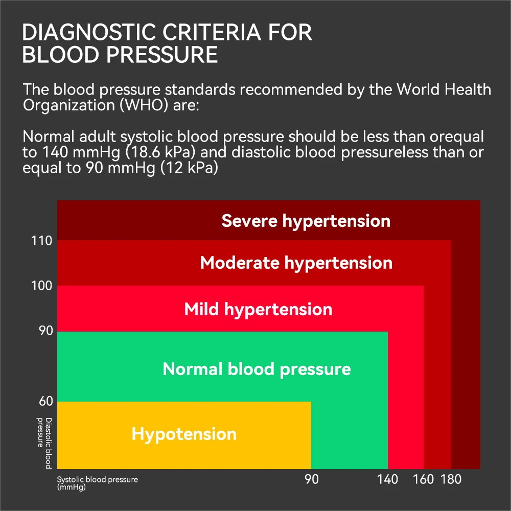 Normal adult systolic blood pressure should be less than orequalto 140 mmHg(18.6 kPa) and diastolic blood pressureless than orequal to 90 mmHg (12 kPa)